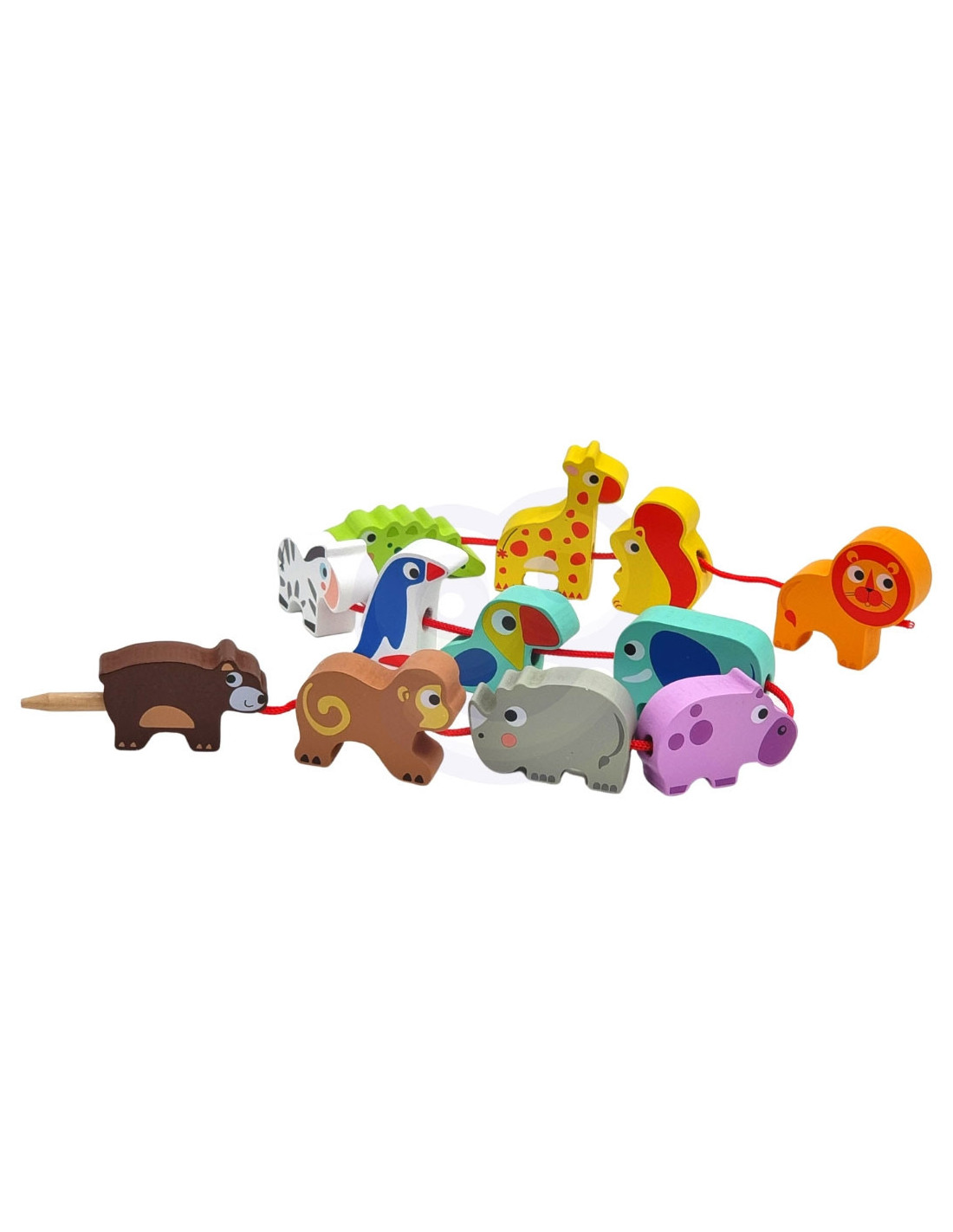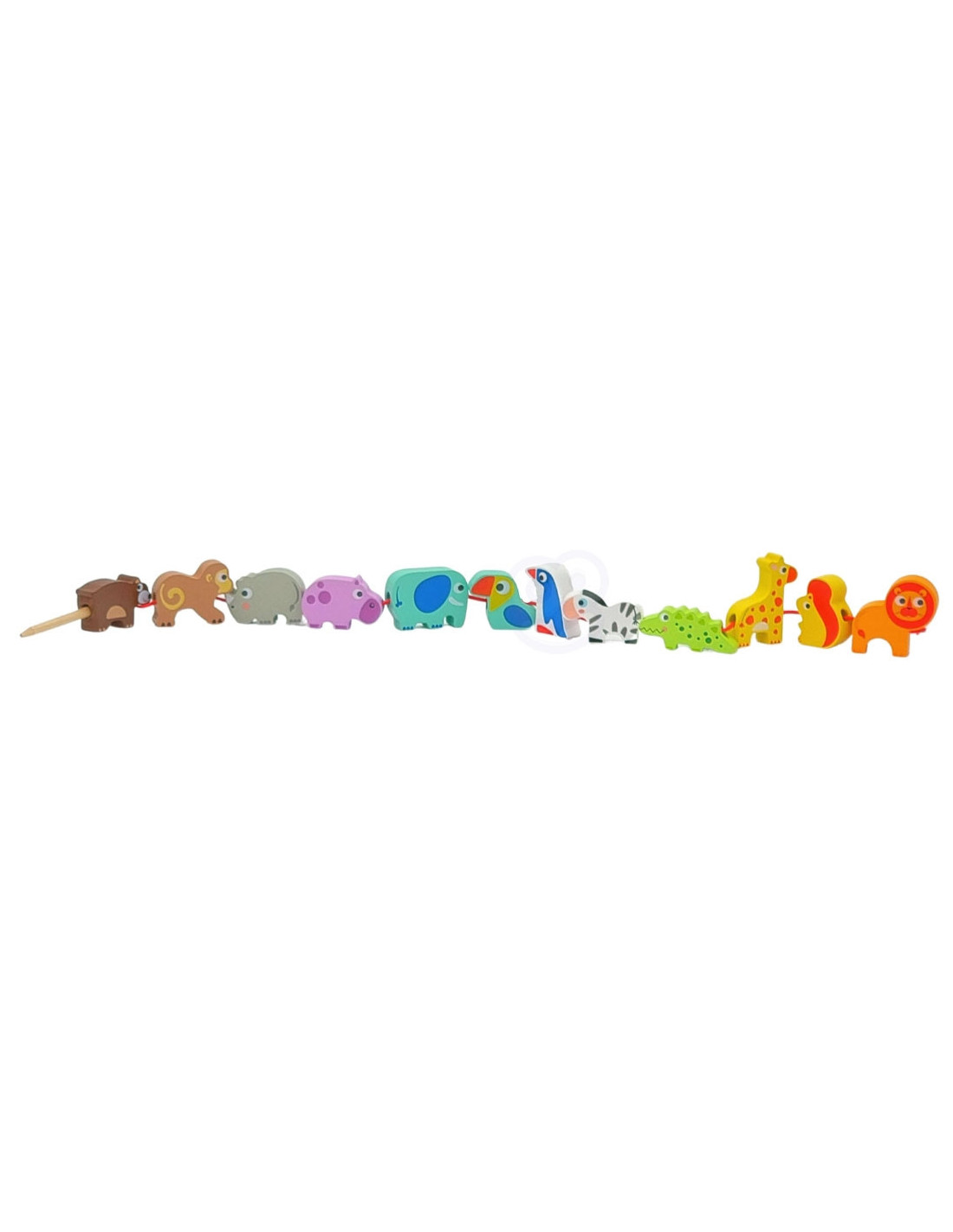 - - W zestawie: 12 drewnianych koralików z motywami safari (np. lew, żyrafa, małpka) + sznureczek