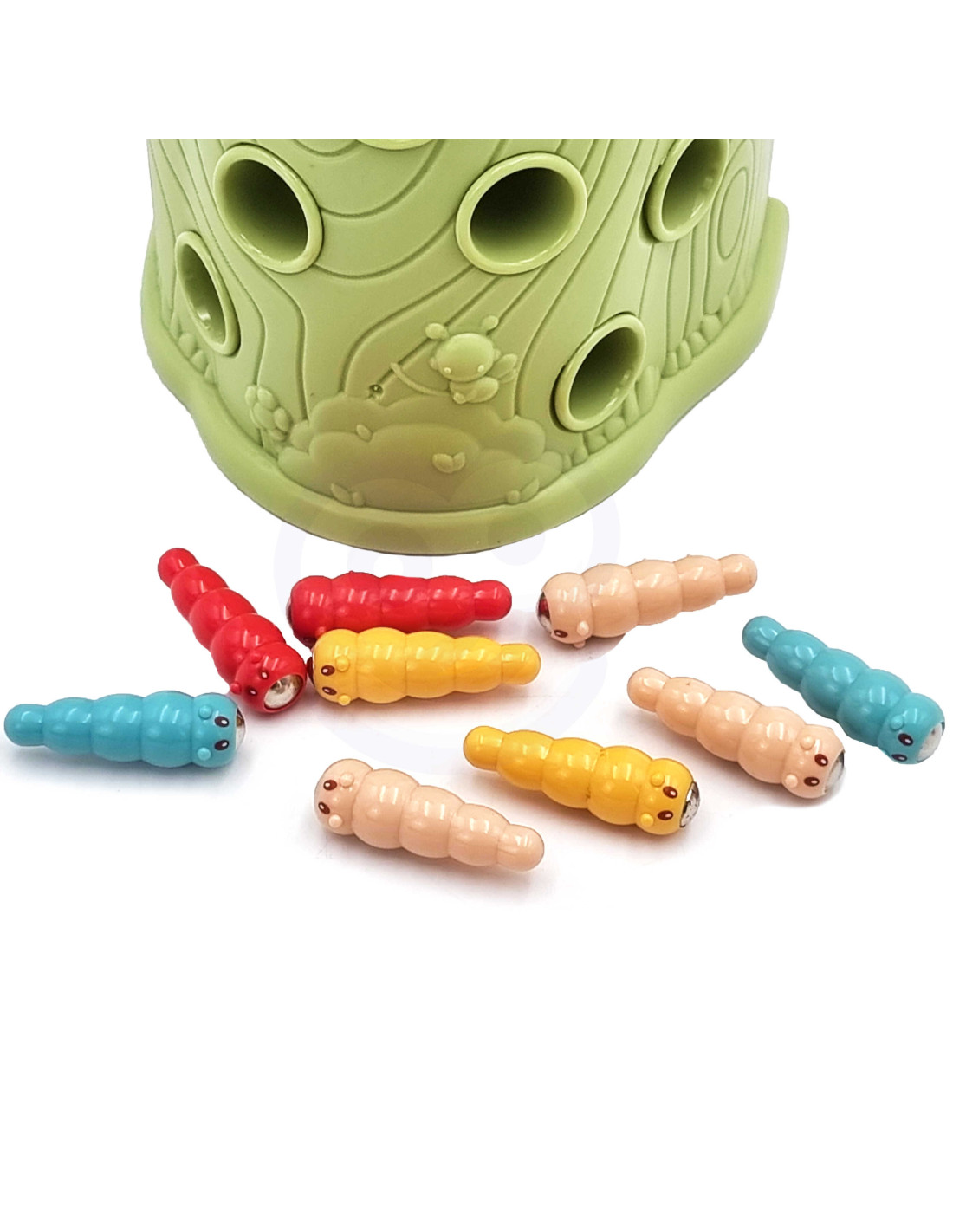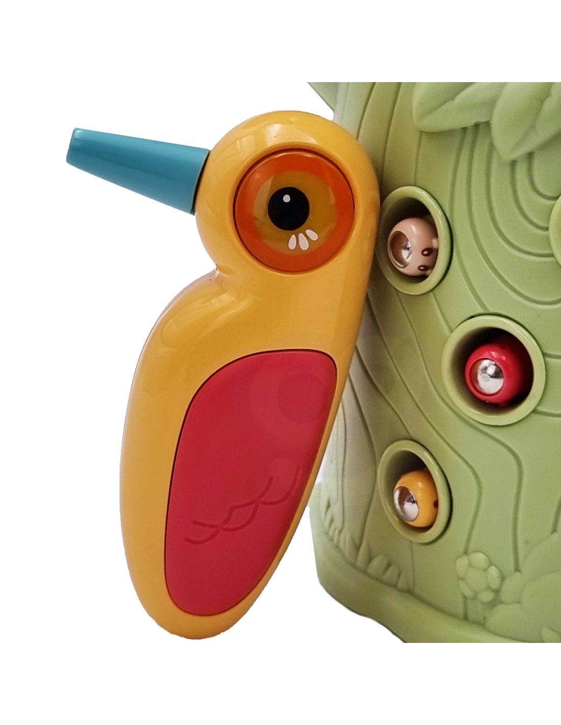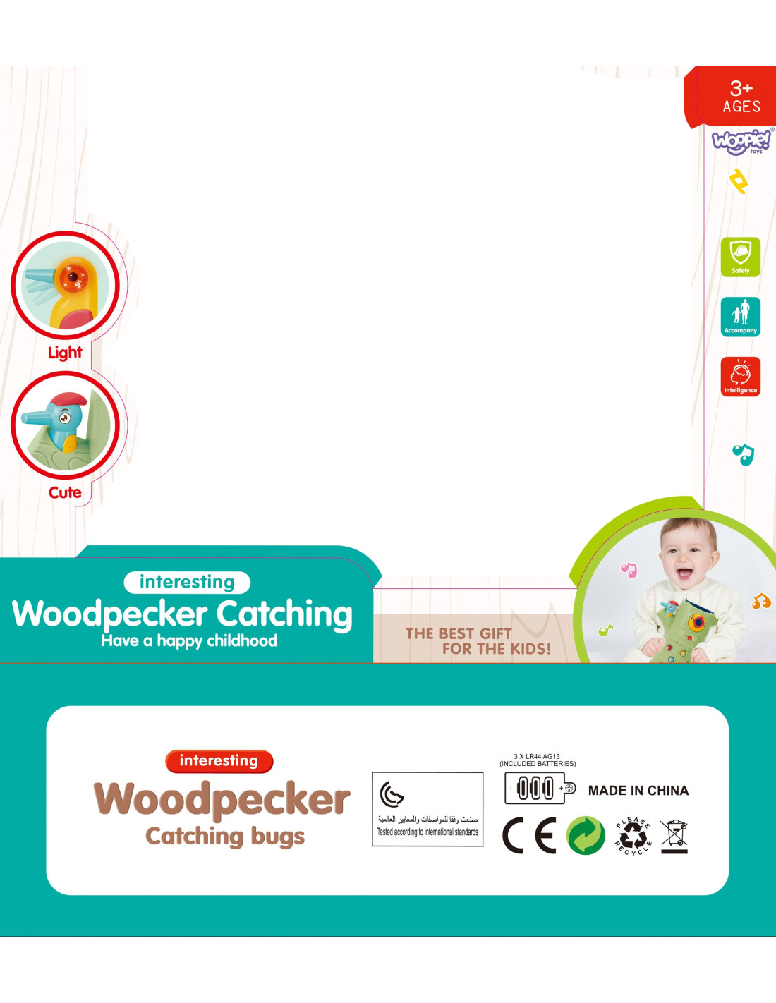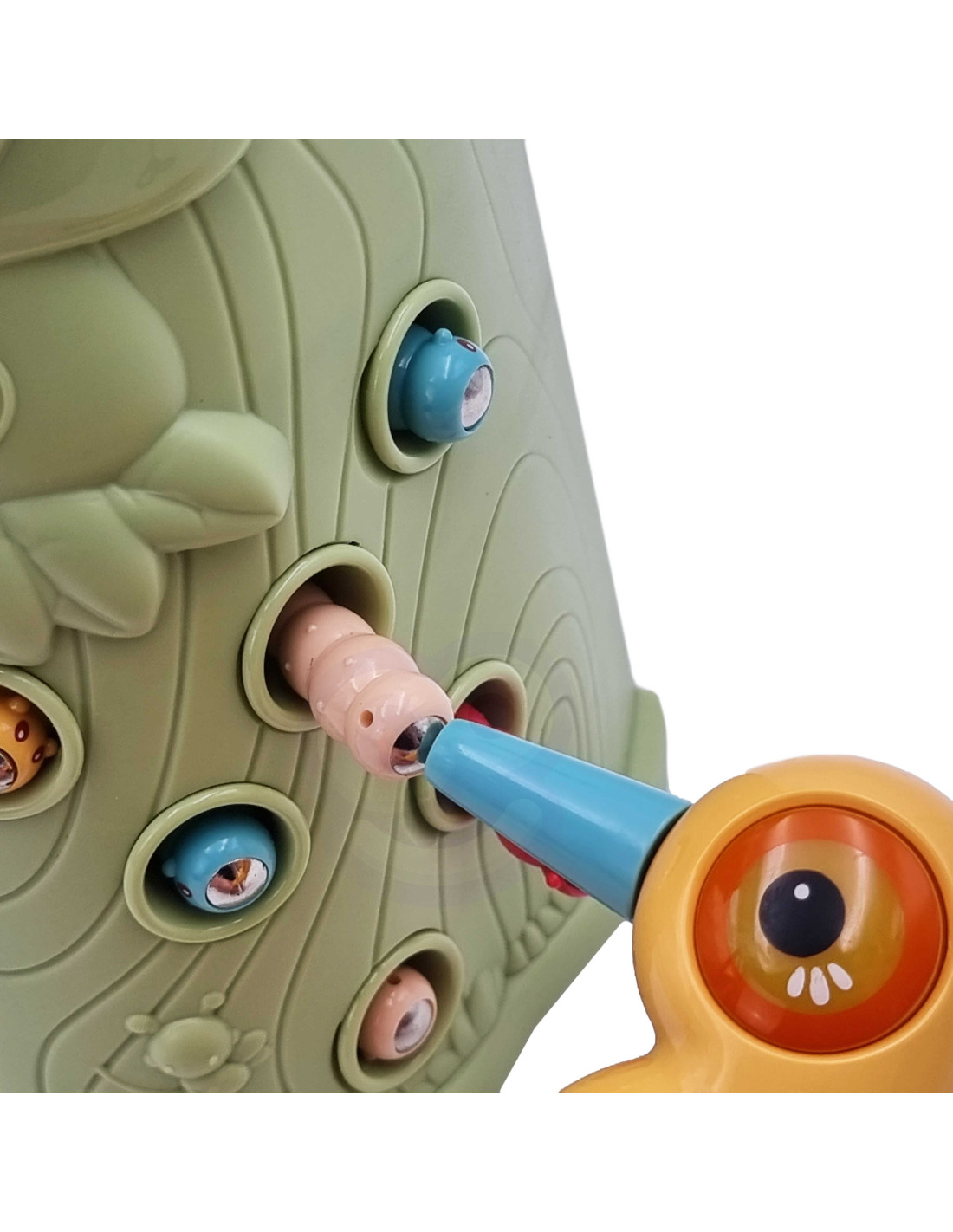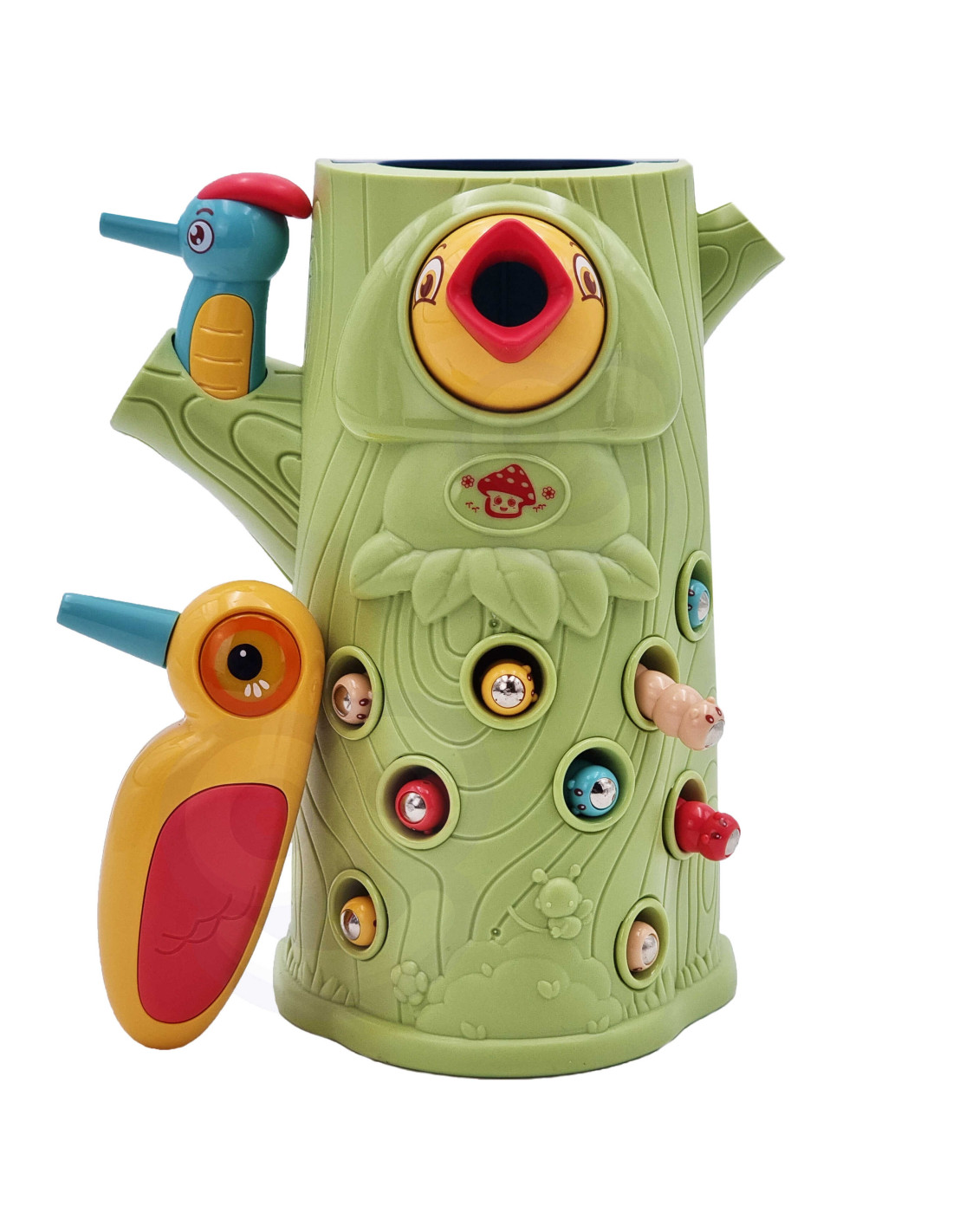 Gra Zręcznościowa Złap Robaczka od marki WOOPIE to doskonały sposób na wspólne spędzanie czasu z dzieckiem. Proste zasady oraz intuicyjna obsługa sprawiają, że zagrać w nią może praktycznie każdy. Zabawa polega na chwytaniu dzięciołem zakończonym magnesem robaczków ukrytych w otworkach znajdujących się w drzewie, a następnie na ich ponownym wkładaniu w dziób ptaszka. W zestawie oprócz dwóch dzięciołów do karmienia pisklaka i kłody z pisklakiem, znajduję się aż 9 robaków. Większy dzięcioł posiada dodatkowe funkcje: świeci, rusza dziobem i wydaję dźwięk oraz melodię. Wystarczy nacisnąć na trzon i zapala się oko dzięcioła oraz wydobywa się skoczna przyjemna melodia, ptak może też ruszyć dziobem w dół., a jego oko zaświeci się przy dźwięku ćwierkania. Zestawem może się bawić jednocześnie dwoje dzieci. Gra uczy przez zabawę - pomoże rozwinąć m. in. umiejętności motoryczne (ruchowe) oraz wzrokowe. Zabawka jest sporym wyzwaniem dla malucha, wymaga skupienia uwagi oraz sprawności manualnej, ale przez to niezwykle zaciekawi dziecko.