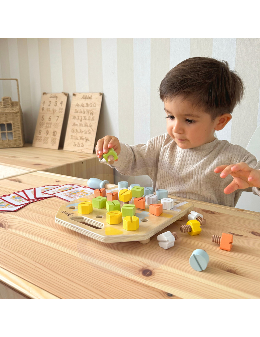 Dzieci rozwijają koordynację, koncentrację oraz siłę nadgarstka i dłoni poprzez wkręcanie. Karty testowe które zawierają gotowe wzory wzbogacają rozgrywkę. Dzieci mogą również bawić się z rodzicami w zapamiętywanie wzorów ułożonych przez rodziców. Maluchy mogą poprawić swoją zdolność rozpoznawania i rozróżniania kolorów i kształtów oraz wzmocnić umiejętności motoryczne.