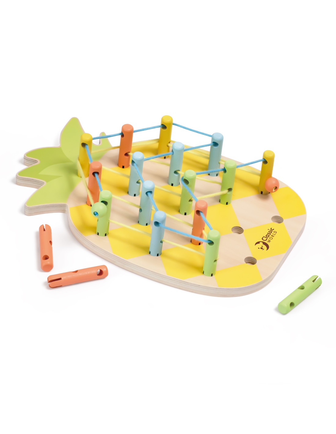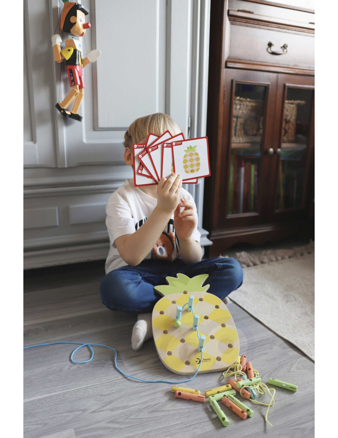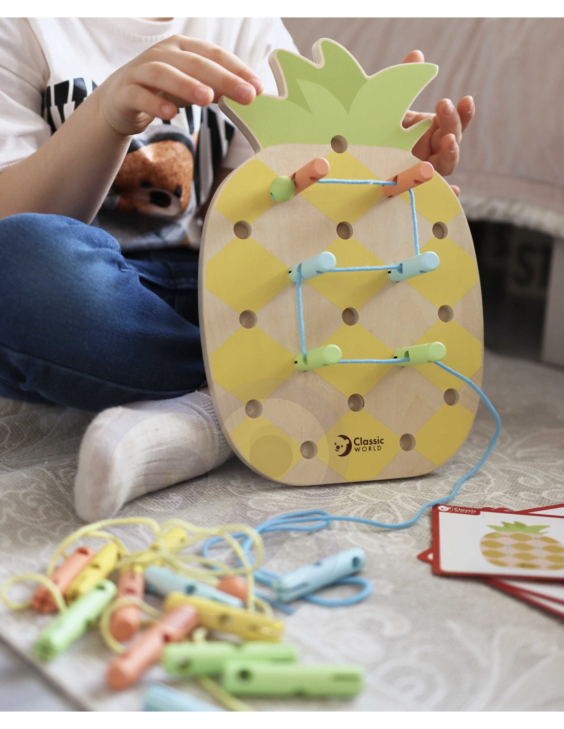 Drewniana Nawlekanka Ananas Kołeczki od marki Classic World to klasyczny zestaw różnokolorowych kołeczków z dziurkami przez które dziecko przeplata sznureczek. Kołeczki można układać w dowolnie wymyślone wzory, co wpłynie pozytywnie na kreatywność malucha i dodatkowo pobudzi jego wyobraźnię. Zabawka zapewni wiele godzin zabawy dla twojego dziecka jednocześnie ćwicząc jego skupienie i koncentrację. Każdy element wykonany jest z dobrej jakości drewna i pomalowany nietoksyczną farbą, dzięki czemu produkt jest w pełni bezpieczny dla dziecka.