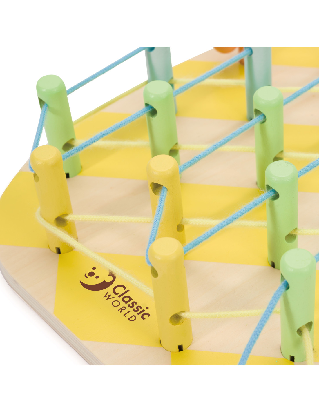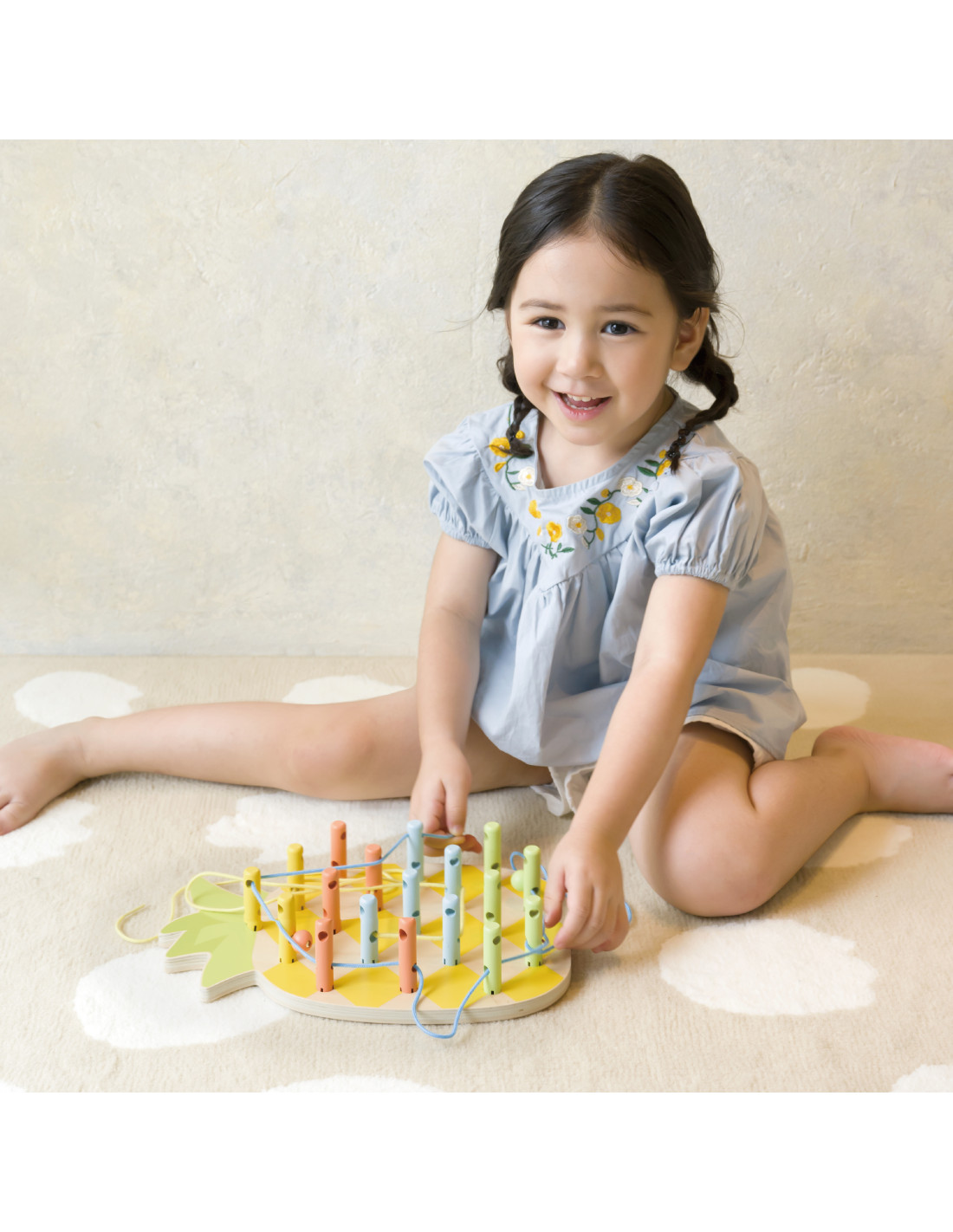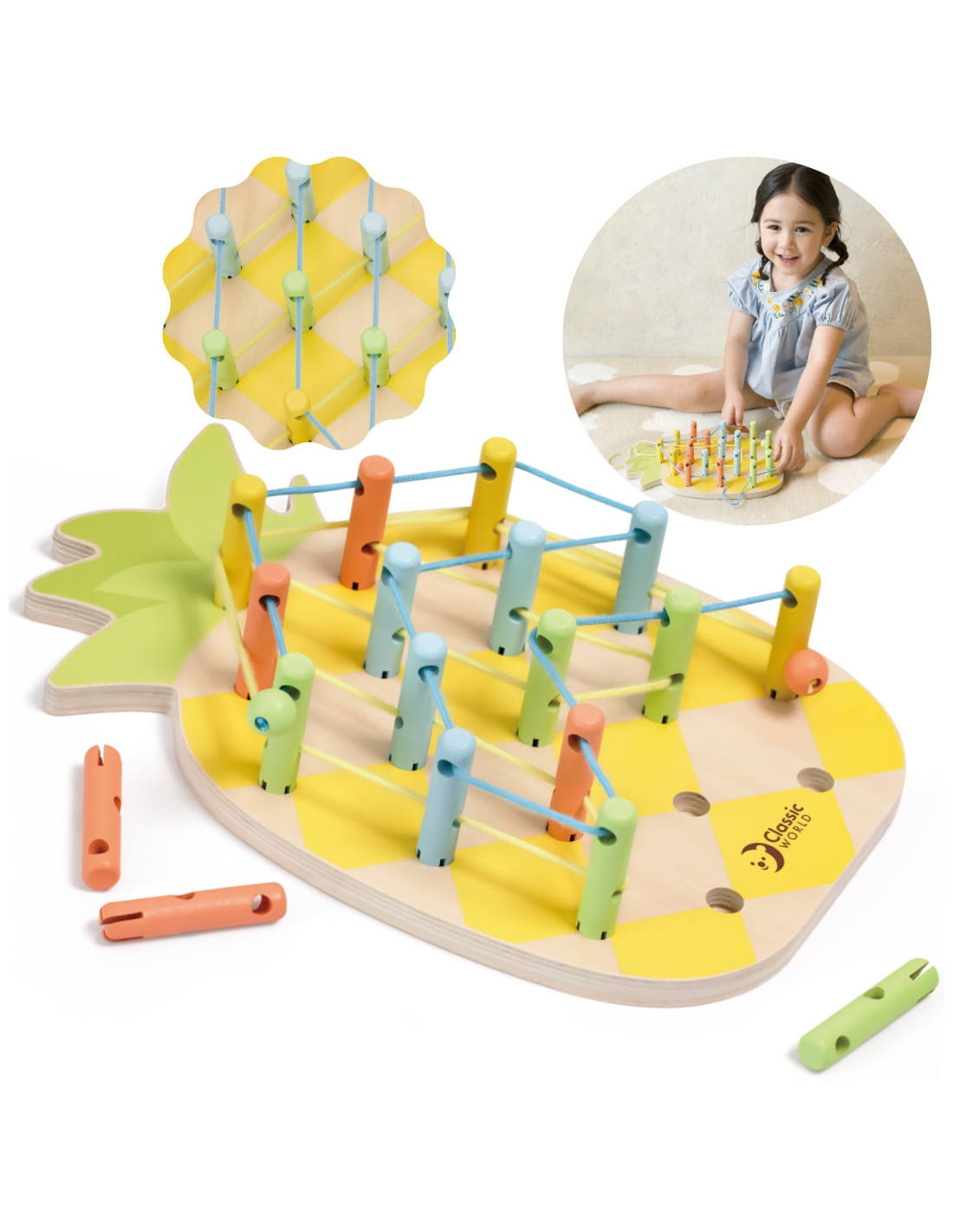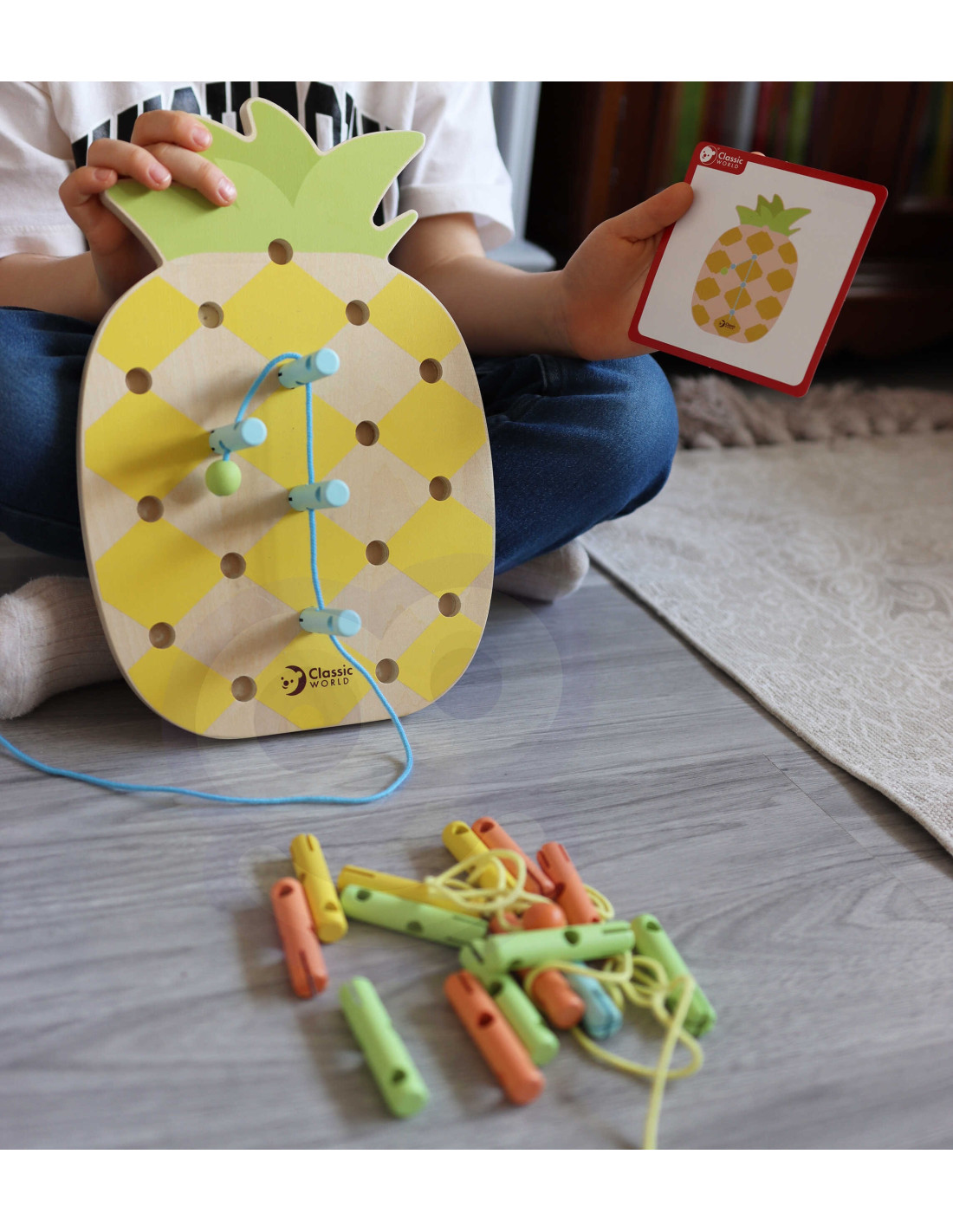 Drewniana Nawlekanka Ananas Kołeczki od marki Classic World to klasyczny zestaw różnokolorowych kołeczków z dziurkami przez które dziecko przeplata sznureczek. Kołeczki można układać w dowolnie wymyślone wzory, co wpłynie pozytywnie na kreatywność malucha i dodatkowo pobudzi jego wyobraźnię. Zabawka zapewni wiele godzin zabawy dla twojego dziecka jednocześnie ćwicząc jego skupienie i koncentrację. Każdy element wykonany jest z dobrej jakości drewna i pomalowany nietoksyczną farbą, dzięki czemu produkt jest w pełni bezpieczny dla dziecka.