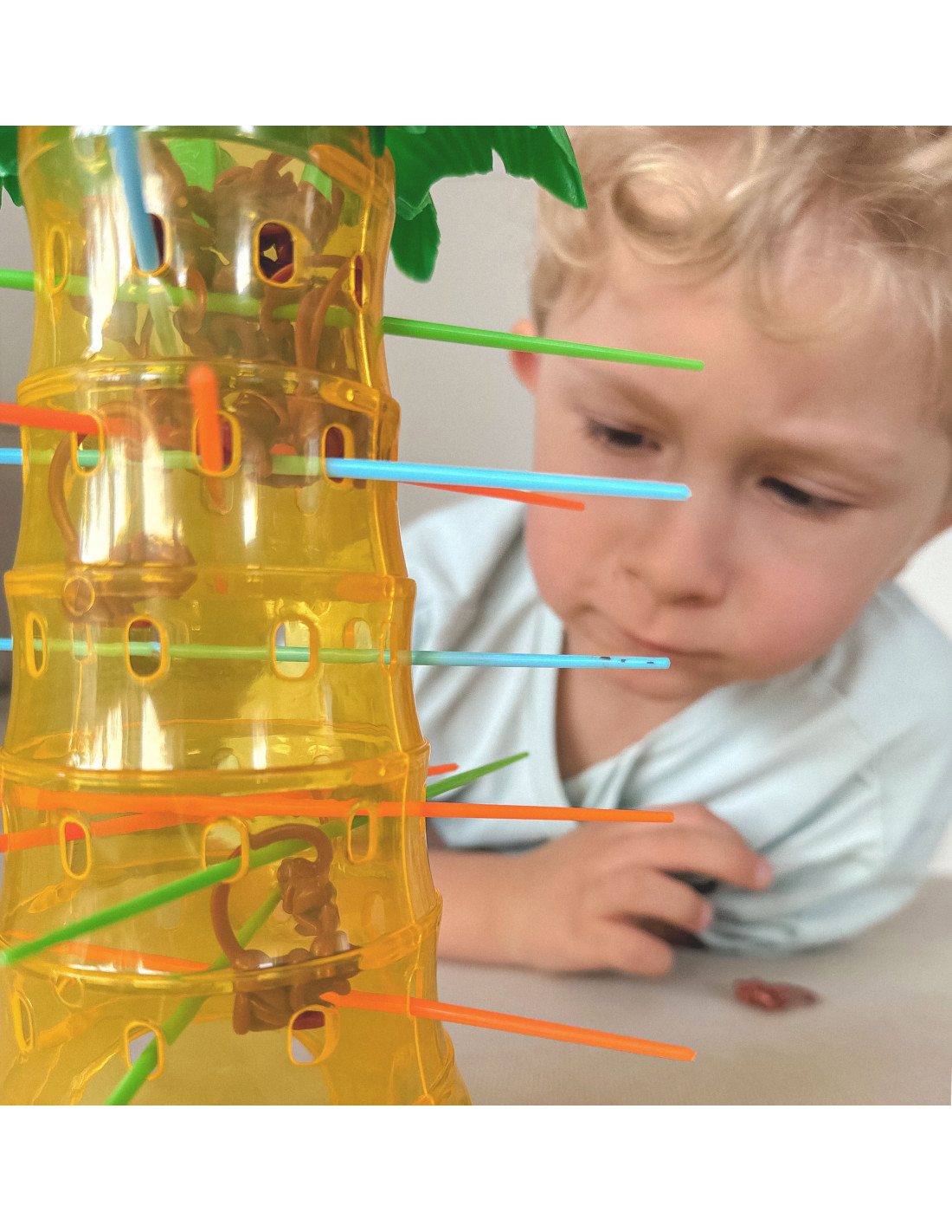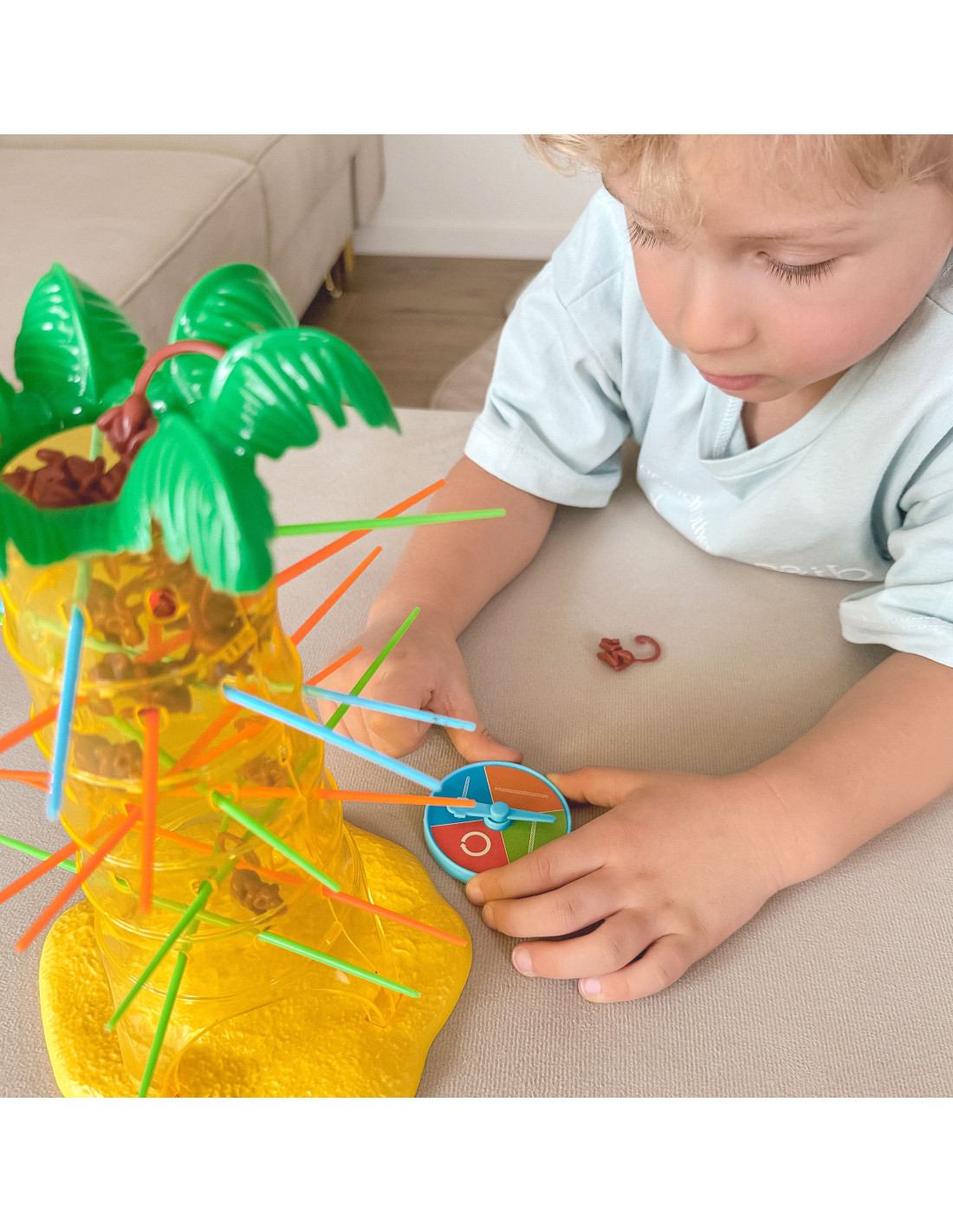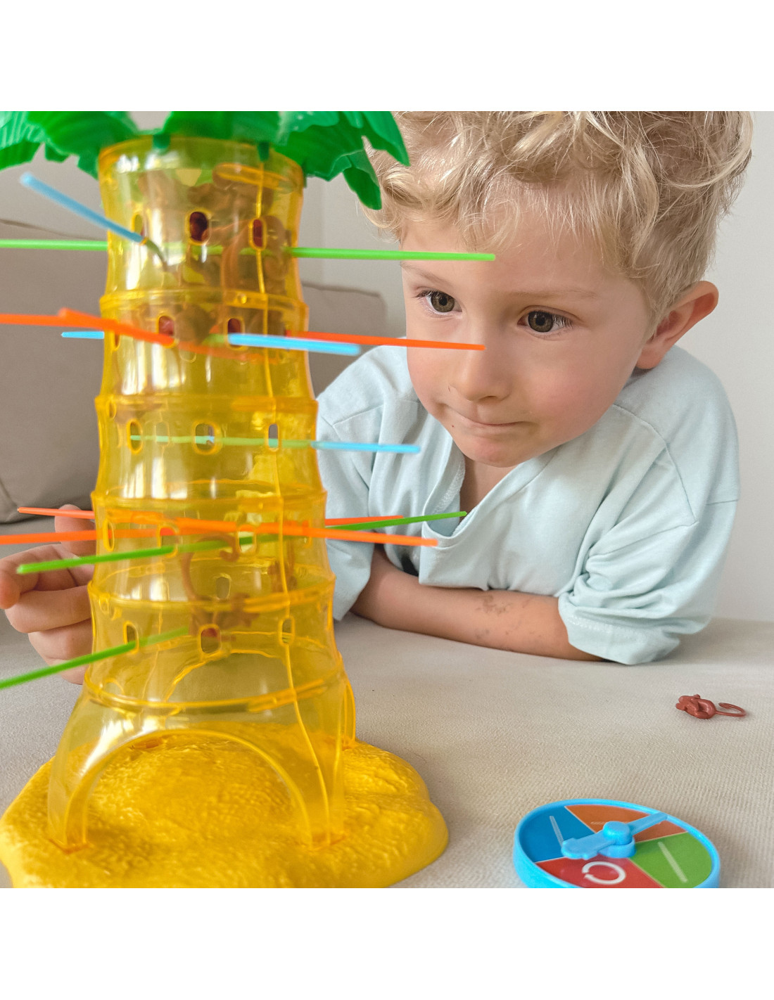 - - zestaw zawiera: palma z otworkami, kolorowe koło ze strzałką, 18 patyczków, 20 małpek, instrukcję