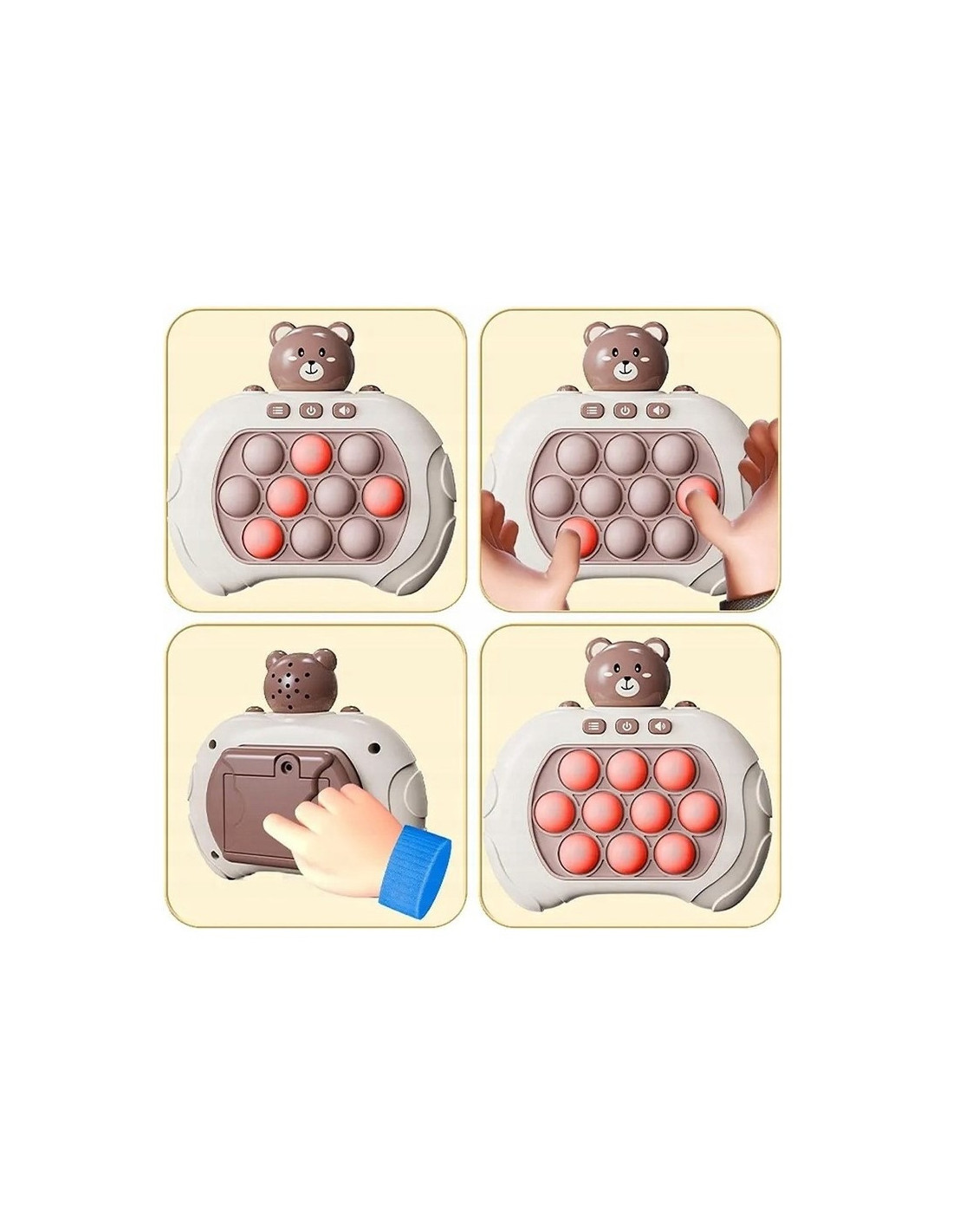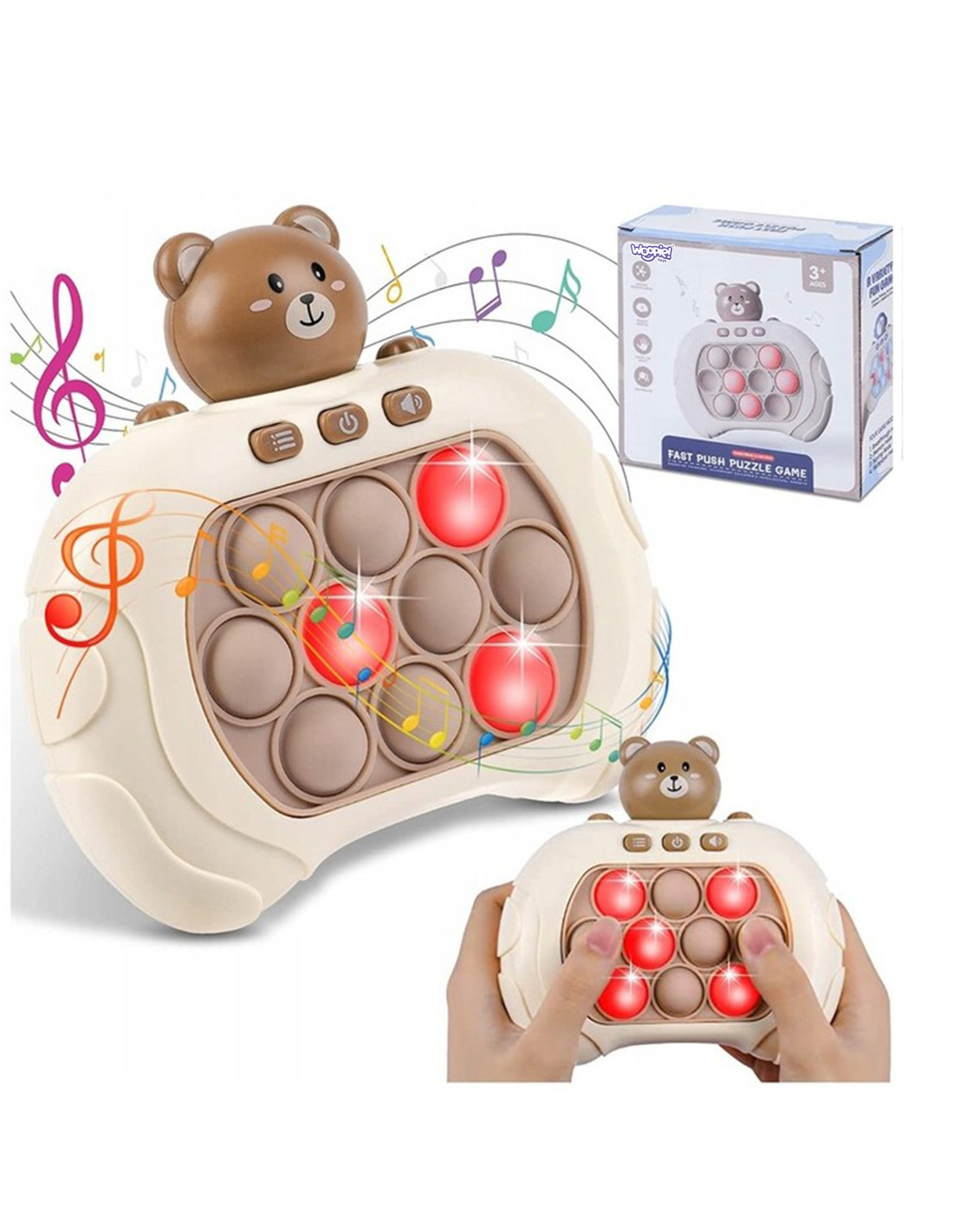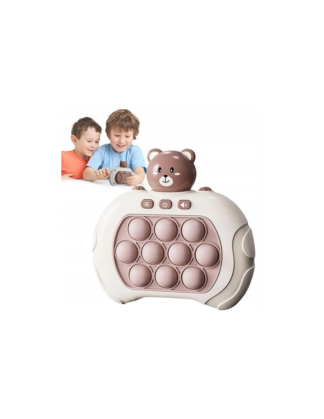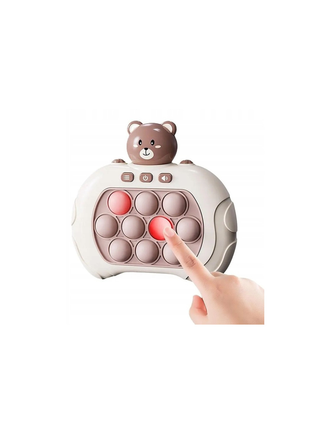 Gra POP IT Miś to zabawka antystresowa, która sprawdzi się już dla najmłodszych. Gra wydaje radosne dźwięki, które zachęcają dzieci do zabawy i urozmaicają rozgrywkę. Zabawka jest niewielka więc, sprawia, że możemy zabrać ją ze sobą. Pop It sprawia frajdę dzieciom oraz dorosłym, którzy chętnie po nią sięgają. Rozwija umysł, zdolności manualne, koordynację wzrokowo-ruchową oraz trenuje spostrzegawczość i pomaga w walce ze stresem.