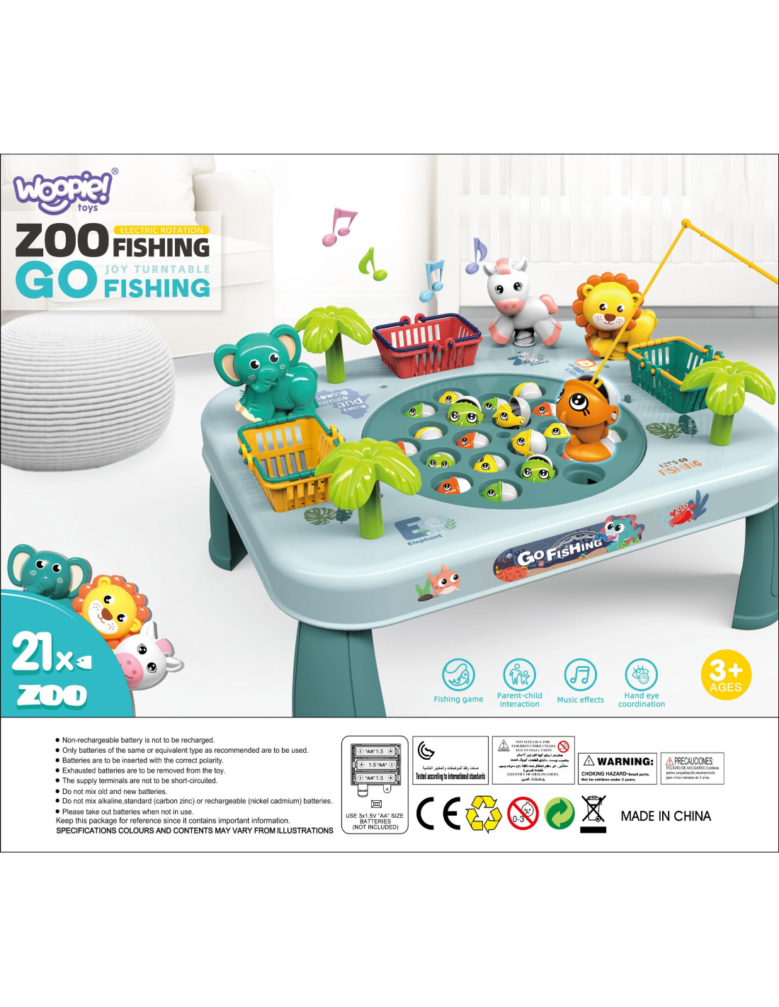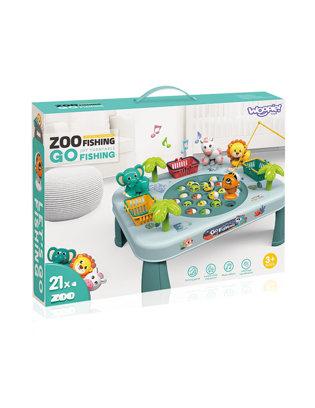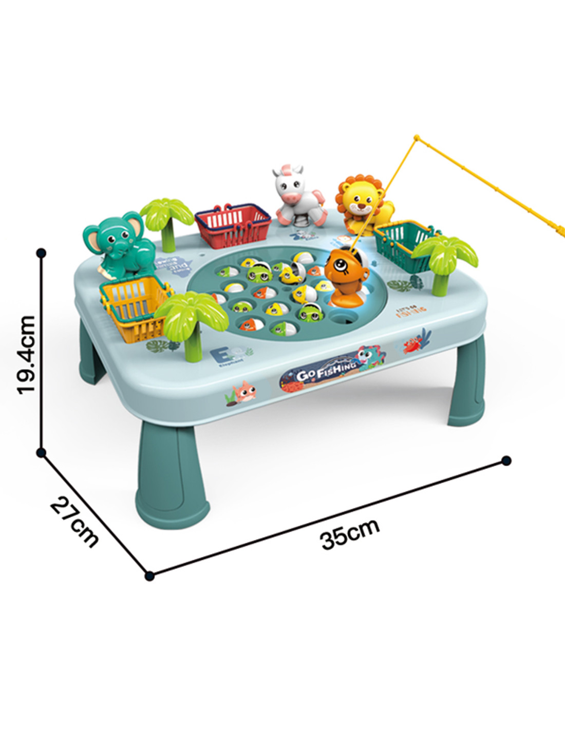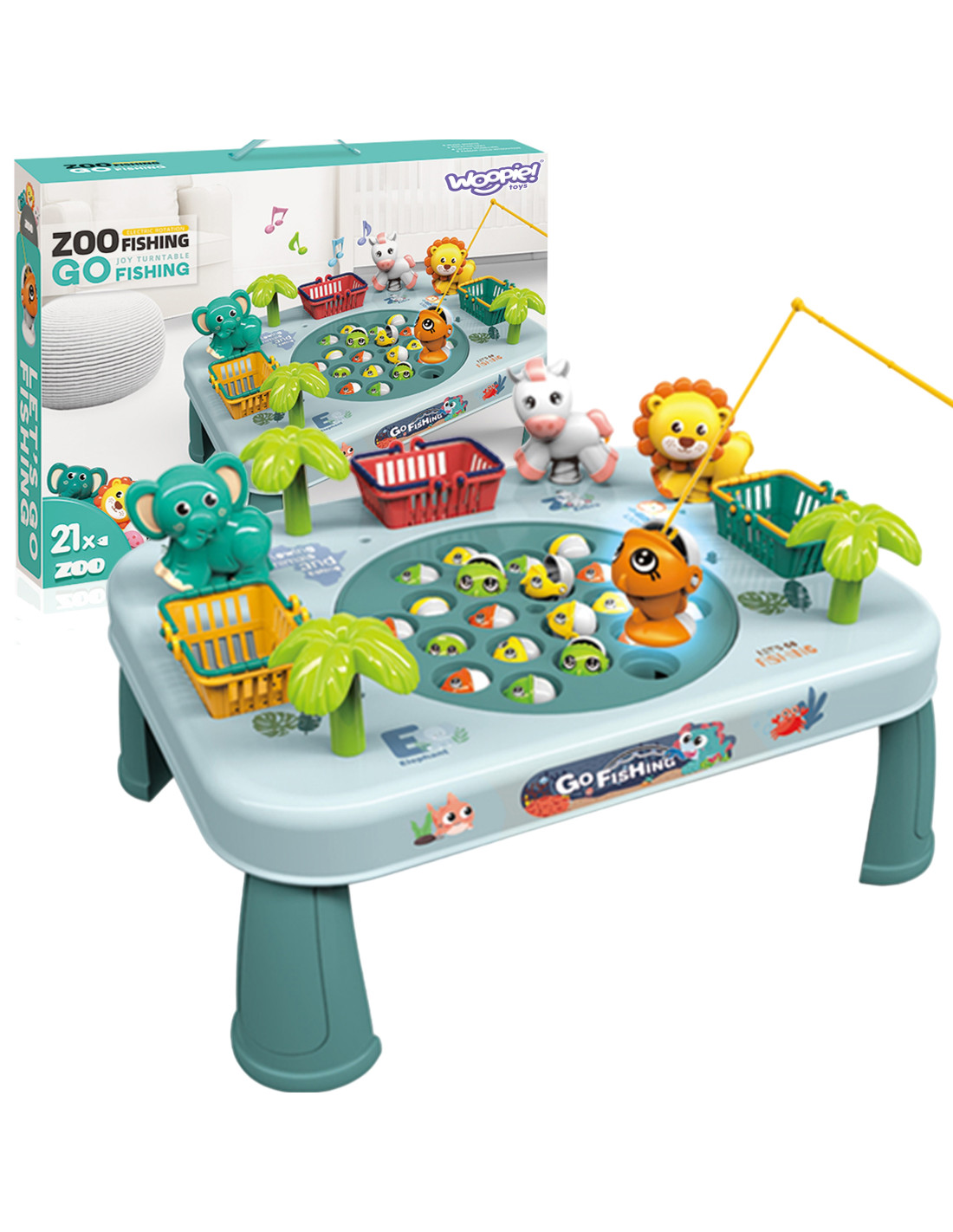 Ten niezwykły stoliczek to brama do nieskończonej rozrywki dla całej rodziny i przyjaciół. Zbudowany z solidnego materiału, jest nie tylko wytrzymały, ale także estetyczny. Jego kolorowy design przyciąga uwagę i zachęca do wspólnej zabawy. Koszyczki umieszczone po bokach stoliczka, są nie tylko praktycznym dodatkiem, ale także elementem rywalizacji. Zbierz jak najwięcej rybek, wrzuć je do koszyków i przygotuj się na zliczanie punktów na koniec gry. Po bokach stoliczka znajdują się również urocze zwierzątka, które są przyjemne dla oka. Aby utrudnić łowienie, plansza na której znajdują się rybki- rusza się. Aby umilić zabawę, stolik wydaje z siebie melodię i efekty dźwiękowe!