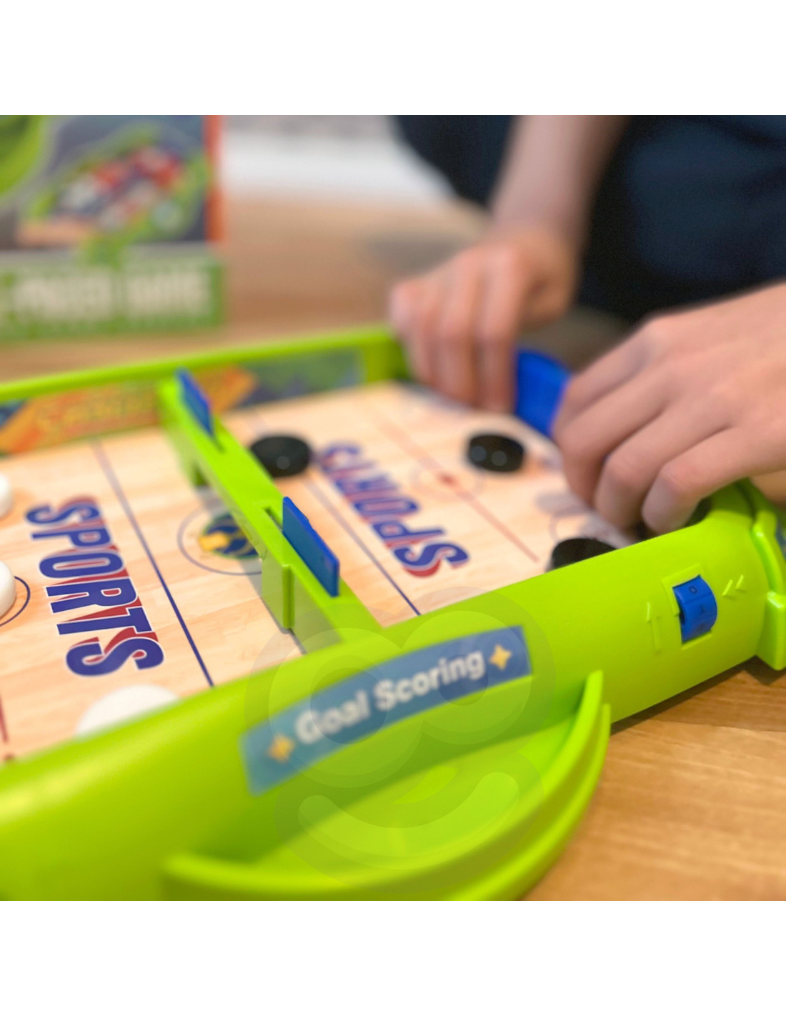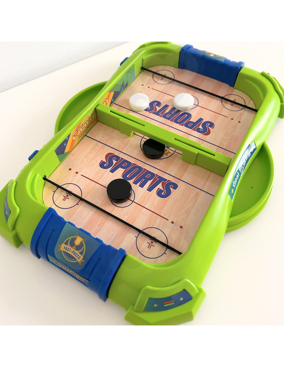 Na obydwu połowach planszy, rozciągnięte są gumeczki do wystrzeliwania krążków. Na środku umieszczona jest ścianka, z małym otworem, aby rozgrywka mogła się rozpocząć. Po bokach zamieszczone są dwie półeczki, w które można wkładać wygrane krążki. Każdy z graczy otrzymuje po 3 pionki - teraz wystarczy naciągnąć gumeczkę z pionkiem i strzelić na pole przeciwnika! Celem gry – jak w hokeju – jest zdobycie większej ilości bramek niż przeciwnik. Gracz, który trafi swoim zawodnikiem do bramki po przeciwnej stronie boiska mniejszą ilość razy – przegrywa.