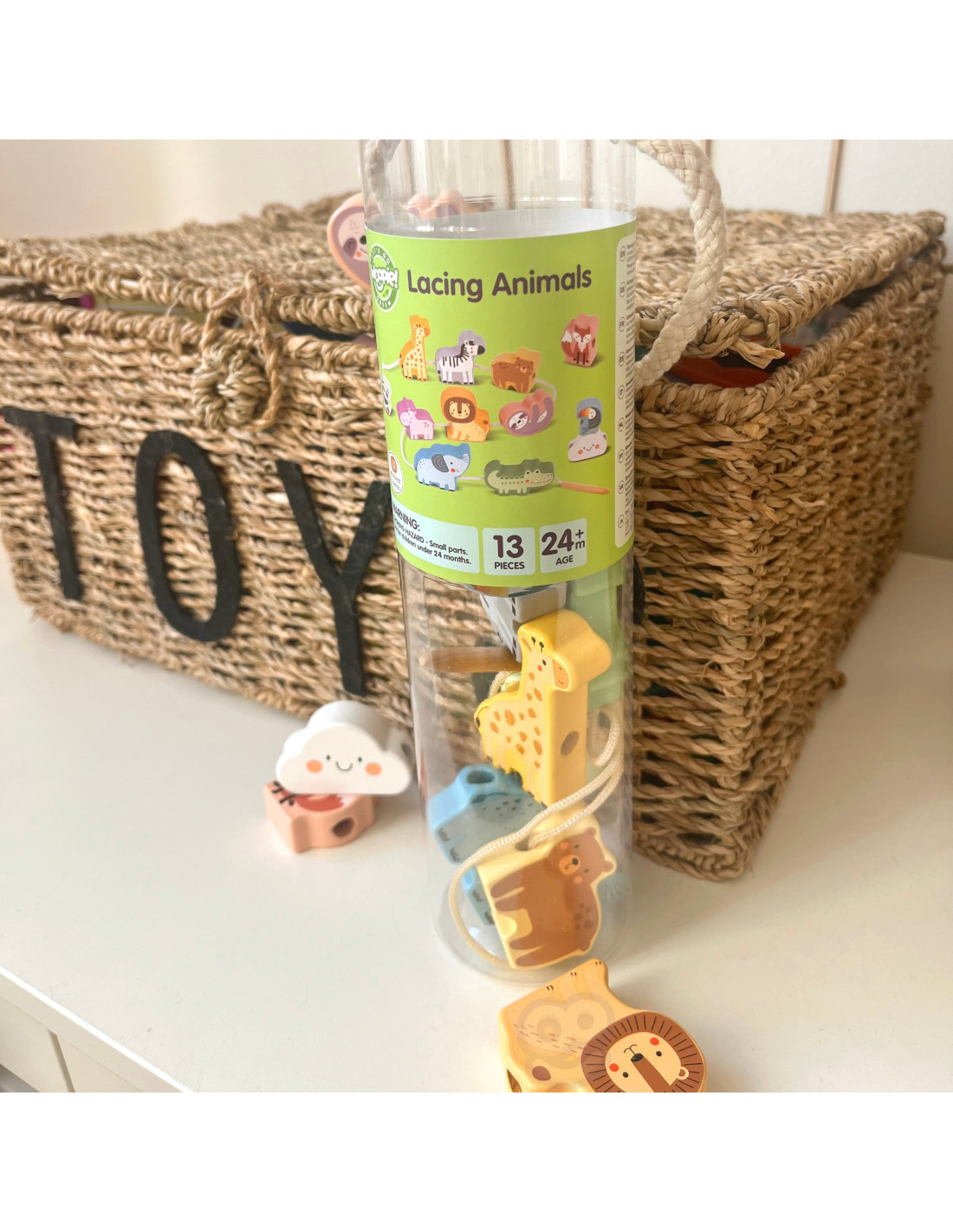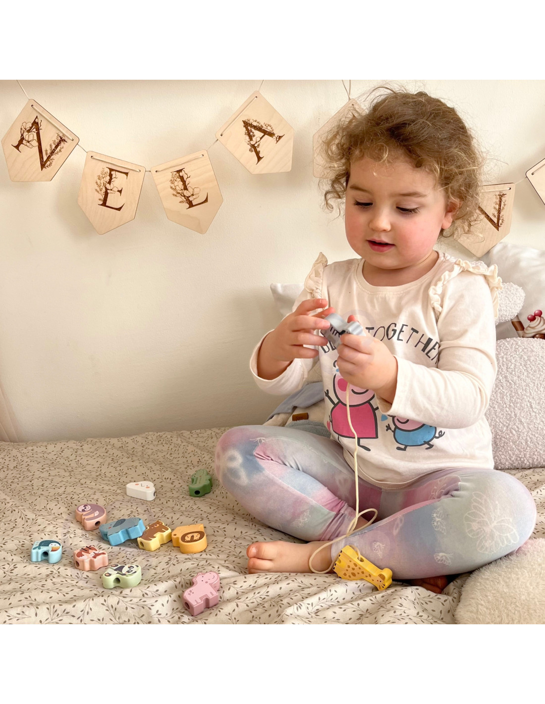 Klocki do nawlekania Zwierzątka ZOO marki WOOPIE GREEN to idealna zabawka wspierająca rozwój zdolności manualnych oraz kreatywnego myślenia. W zestawie znajdziesz 11 uroczych, drewnianych zwierzątek i wesołą chmurkę, które można nawlekać na dołączony sznureczek. Każde zwierzątko posiada specjalne otwory, które zachęcają do precyzyjnego przeplatania. To klasyczna zabawa w nowoczesnym, pastelowym wydaniu, która angażuje dziecko na długie godziny, jednocześnie wspierając rozwój motoryczny i poznawczy. Wszystkie elementy zostały wykonane z bezpiecznego drewna i pomalowane nietoksycznymi farbami – z myślą o najmłodszych odkrywcach