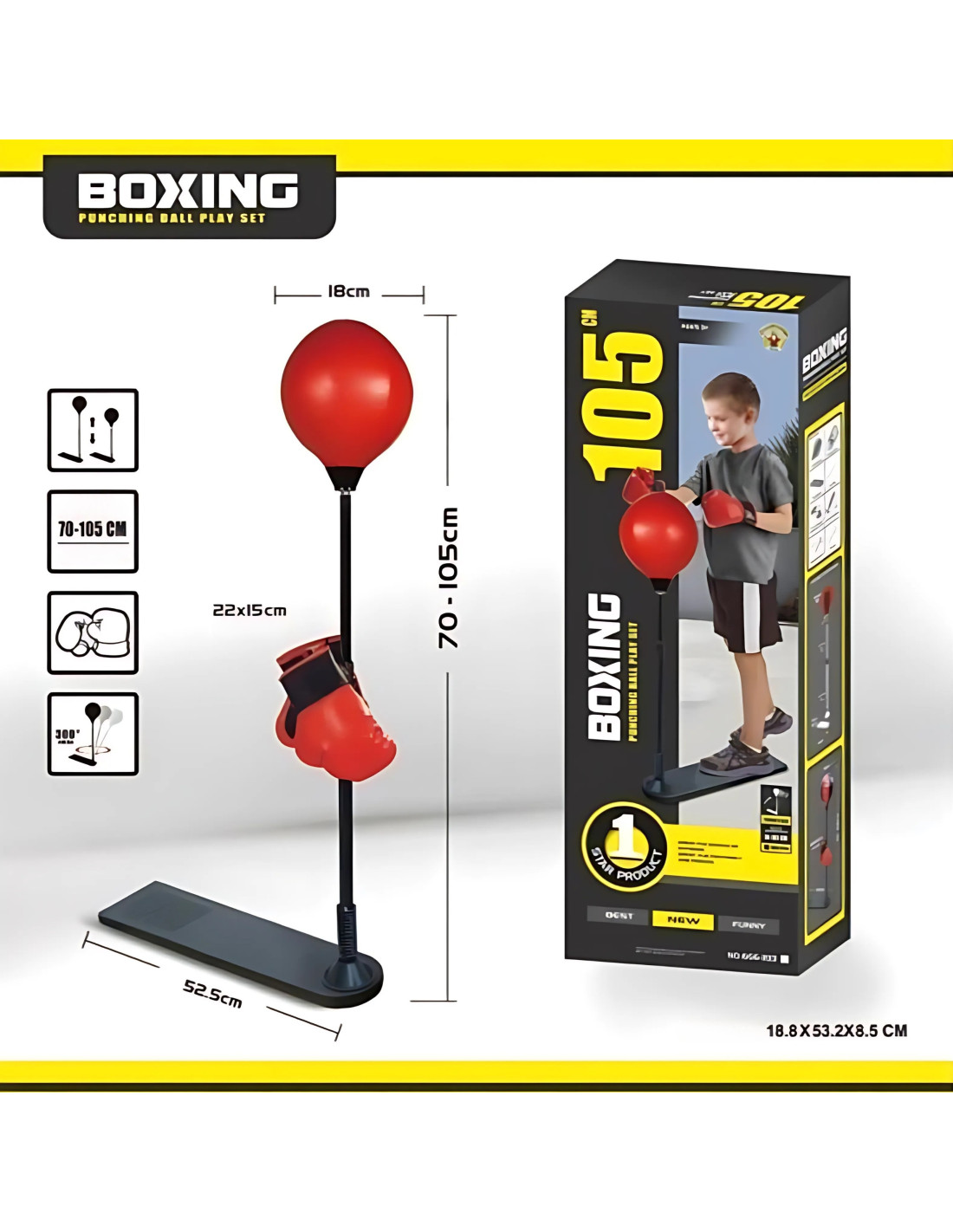 Zestaw bokserski Stojąca Regulowana Gruszka od marki Woopie to idealna propozycja dla dzieci, które chcą aktywnie spędzać czas i poczuć się jak prawdziwi mistrzowie ringu! Zabawka zapewnia mnóstwo radości, pozwala wyładować energię i doskonalić swoje umiejętności, a przy tym gwarantuje świetną zabawę w domu i na świeżym powietrzu. W komplecie znajdują się rękawice bokserskie oraz regulowany stojak z gruszką, dzięki czemu zestaw dopasowuje się do jego potrzeb.