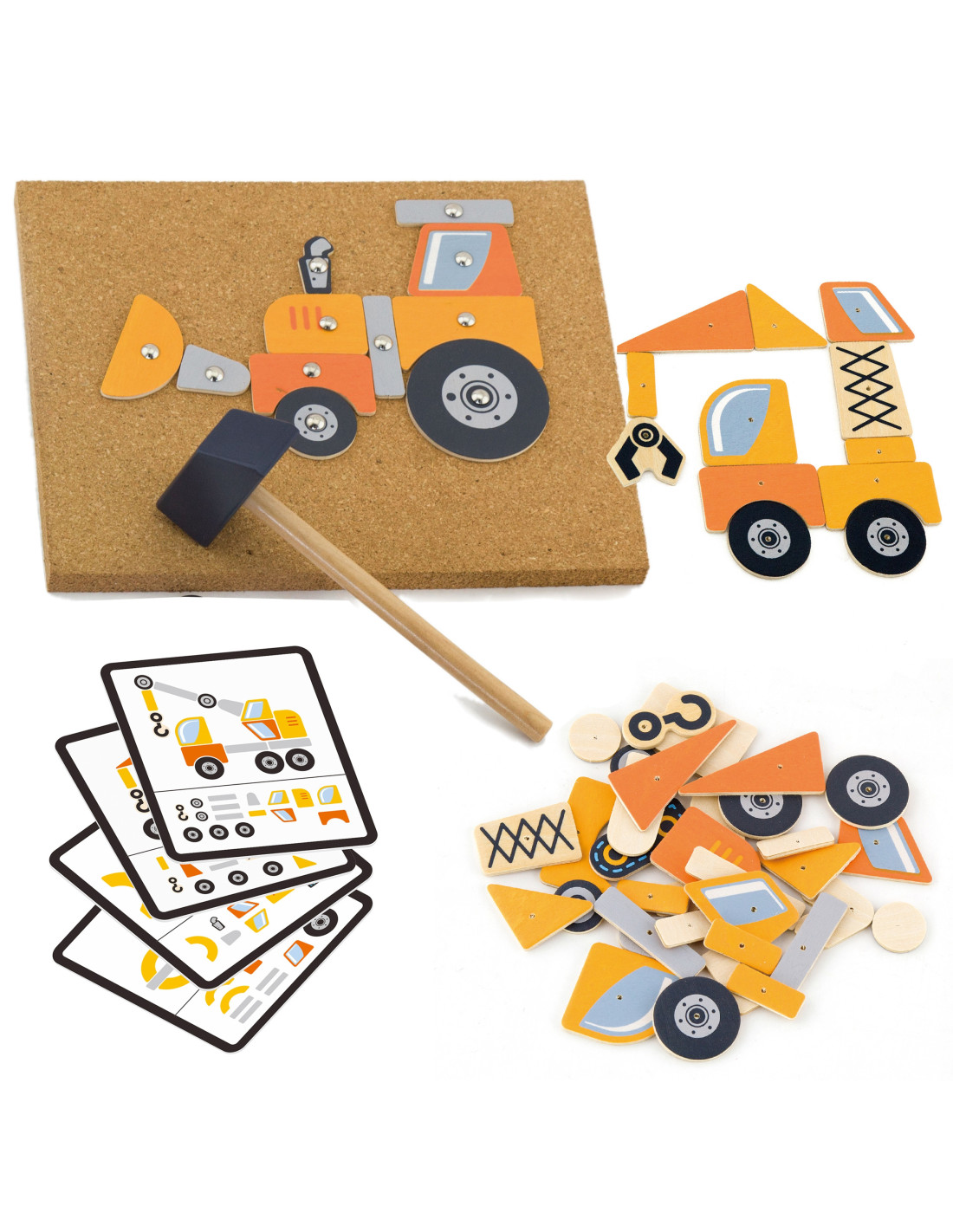 Przybijanka korkowa Pojazdy Budowlane od marki Viga Toys to idealna tablica dla małego konstruktora. Zabawka ta jest zgodna z nurtem Montessori. Zestaw zawiera 45 elementów, tablice korkową i młoteczek. Każdy drewniany element posiada otwór i dziecko za pomocą pinesek może wbić dowolny kształt do tablicy. Elementy dziecko może układać, również dowolnie zgodnie ze swoja wyobraźnią i kreatywnością. Korkowe przybijanki to zabawki wspierające rozwój umiejętności manualnych, logicznych oraz koncentracji. Elementy posiadają zaokrąglone krawędzie przez co są w 100% bezpieczne dla dzieci.